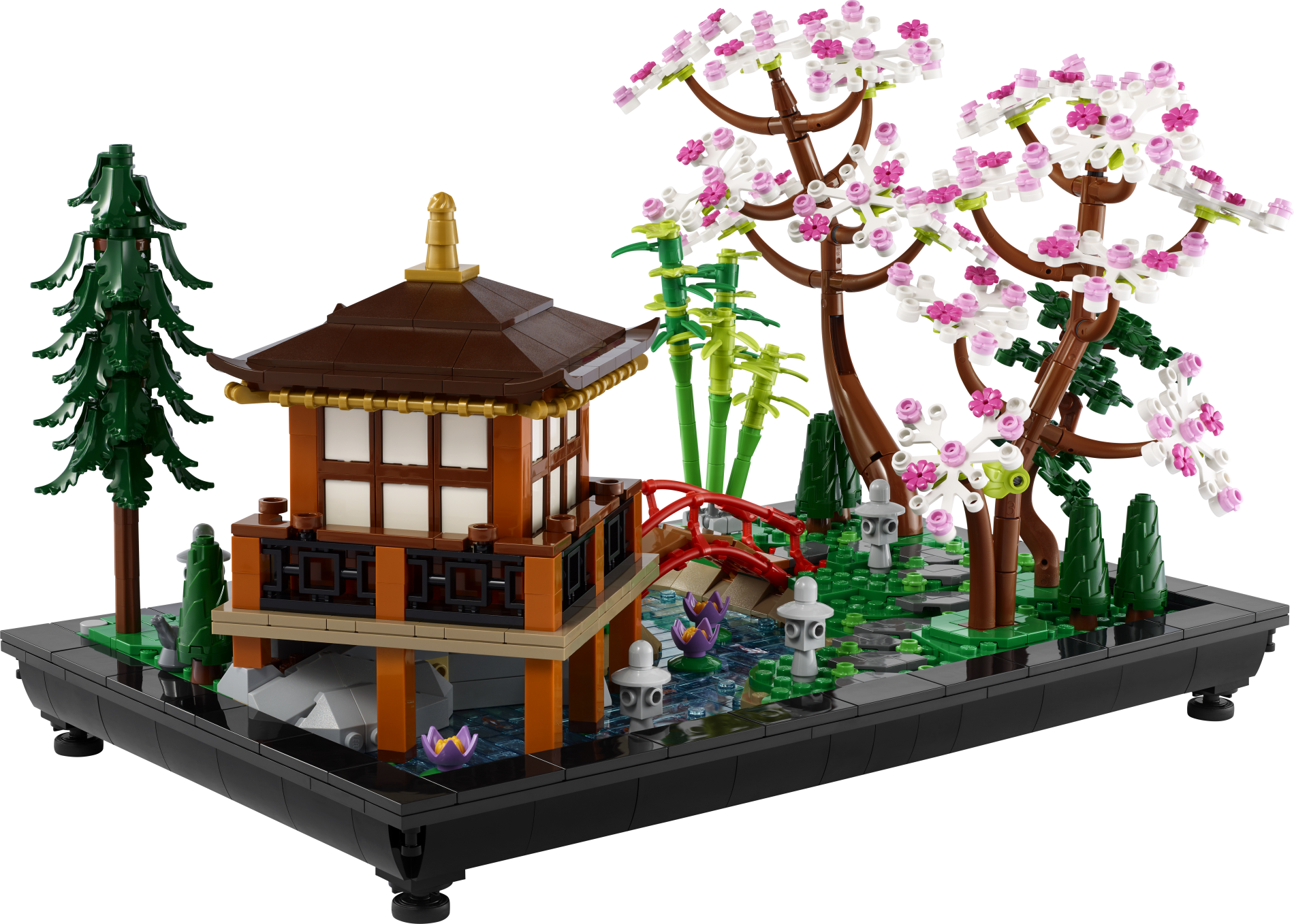 В набор входит изящная диорама сада, включающая павильон для чайной церемонии, изогнутый мостик, ручей с карпами кои, камни, фонари и декоративные растения. Все элементы выполнены с высокой детализацией и создают цельную композицию.