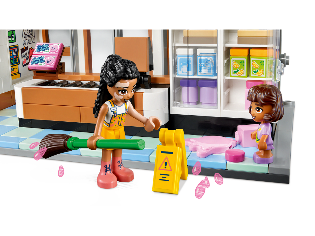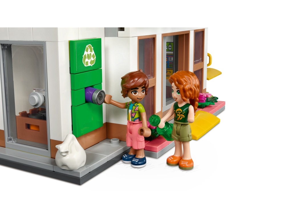 Соберите детализированный двухэтажный магазин с открывающимся фасадом, террасой на крыше и ветряной мельницей. Внутри вас ждёт всё для ведения экологичного бизнеса: стойки с свежими фруктами и овощами, полки с товарами без упаковки, касса и даже уголок для переработки отходов с контейнерами для сортировки. В набор входят три минифигурки подруг LEGO Friends — они готовы помогать покупателям, взвешивать продукты и заботиться о чистоте планеты. Дополнительные аксессуары, такие как сумки-шоперы, тележка, весы и корзинка, сделают игру ещё реалистичнее.