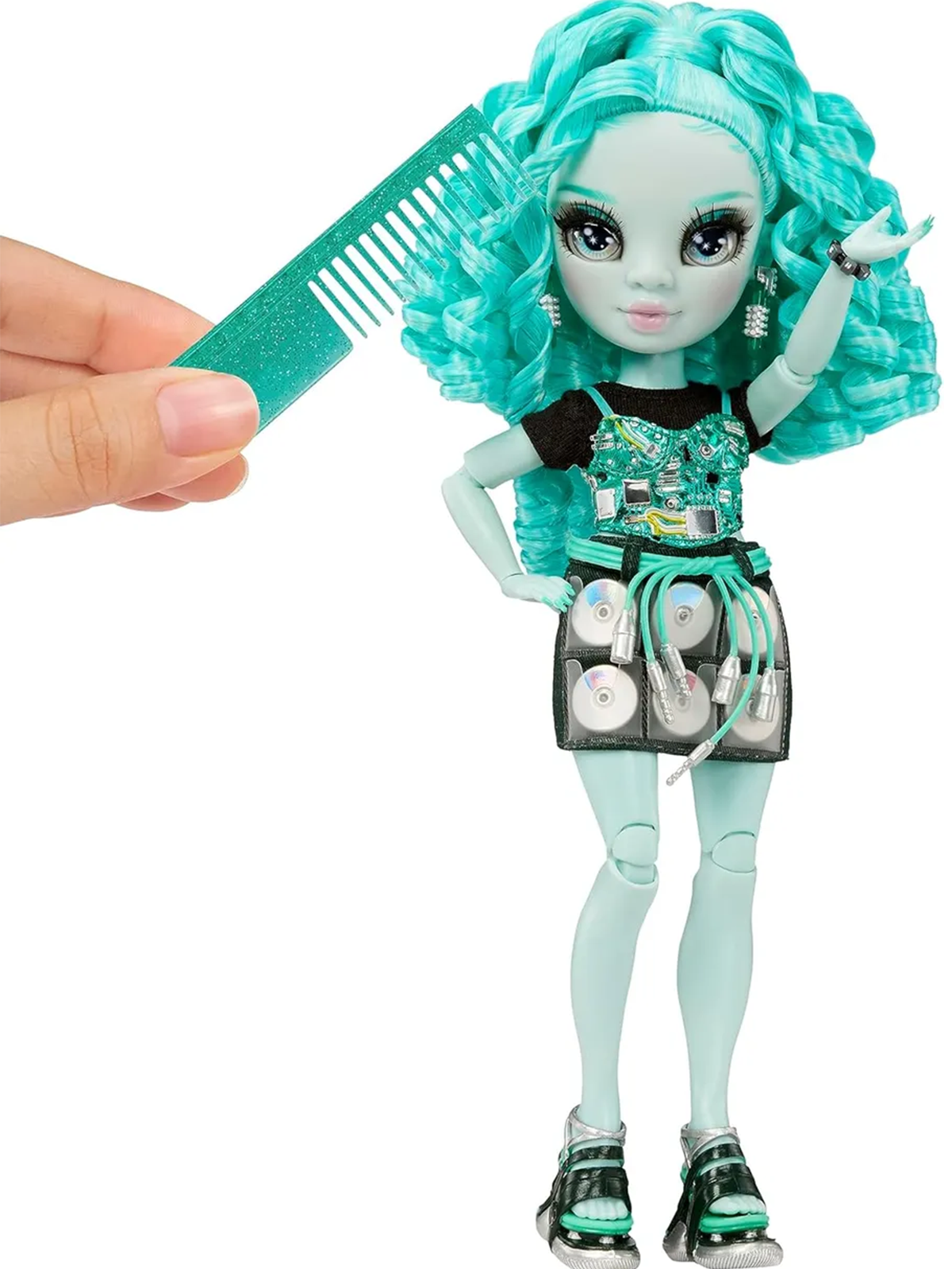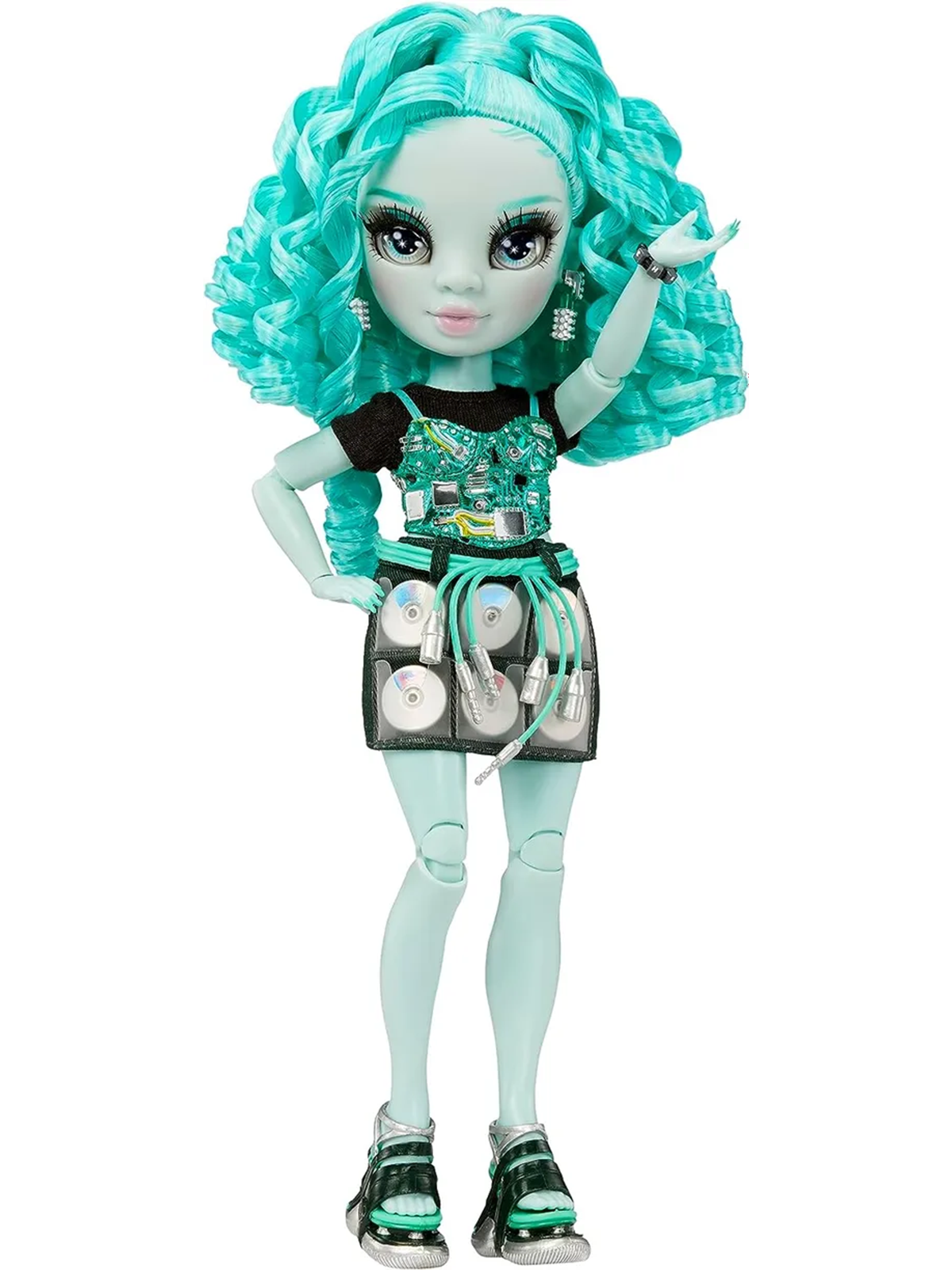 Её наряд — смесь уличного стиля и арт-объекта. Основой служит лаконичная чёрная футболка, поверх которой наброшена блестящая парка с геометрическим рисунком в сине-зелёной гамме. Но главный акцент — юбка-трансформер. Её конструкция напоминает винтажный футляр для дисков, где в прозрачных карманах хранится коллекция сине-зелёных CD. Образ завершает обувь на массивной платформе в чёрно-бело-бирюзовых тонах.