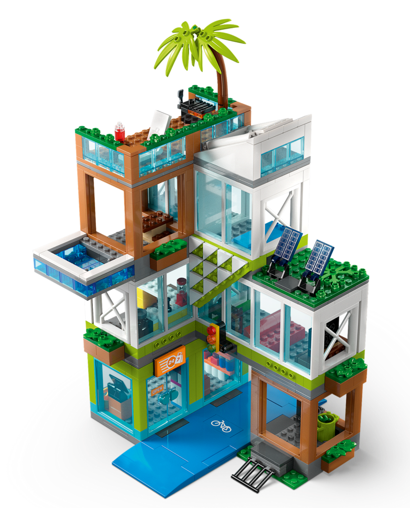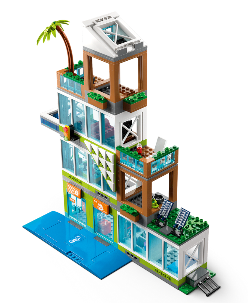Соберите современный трёхэтажный жилой дом с открывающимся фасадом, что обеспечивает удобный доступ к интерьерам. На первом этаже расположился цветочный магазин с витриной, на втором — уютная квартира с гостиной и кухней, а на третьем — творческая мастерская художника с мольбертом. К дому примыкает детская площадка с горкой и качелями. В набор входят минифигурки жильцов разного возраста (взрослые и дети), а также фигурка собаки. Множество аксессуаров (цветы, картины, игрушки, посуда, скейтборд) помогают оживить истории из городской жизни.