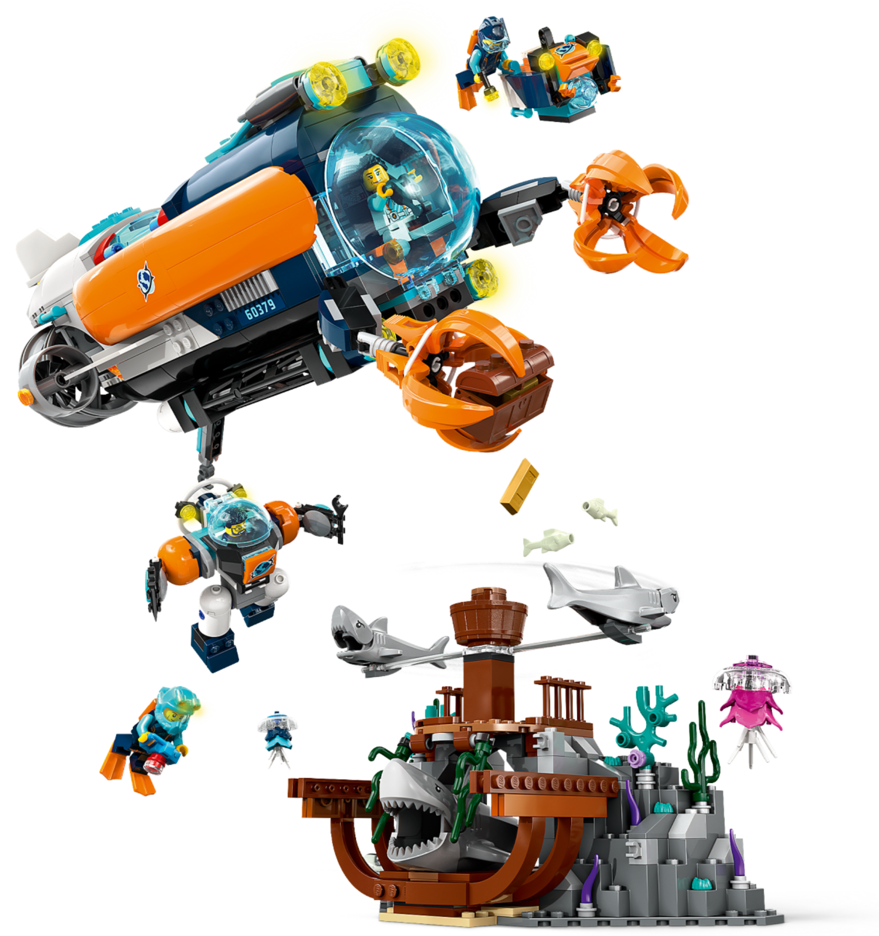 Набор включает несколько минифигурок исследователей, что позволяет разыгрывать полноценные экспедиции и создавать собственные приключения на морском дне.