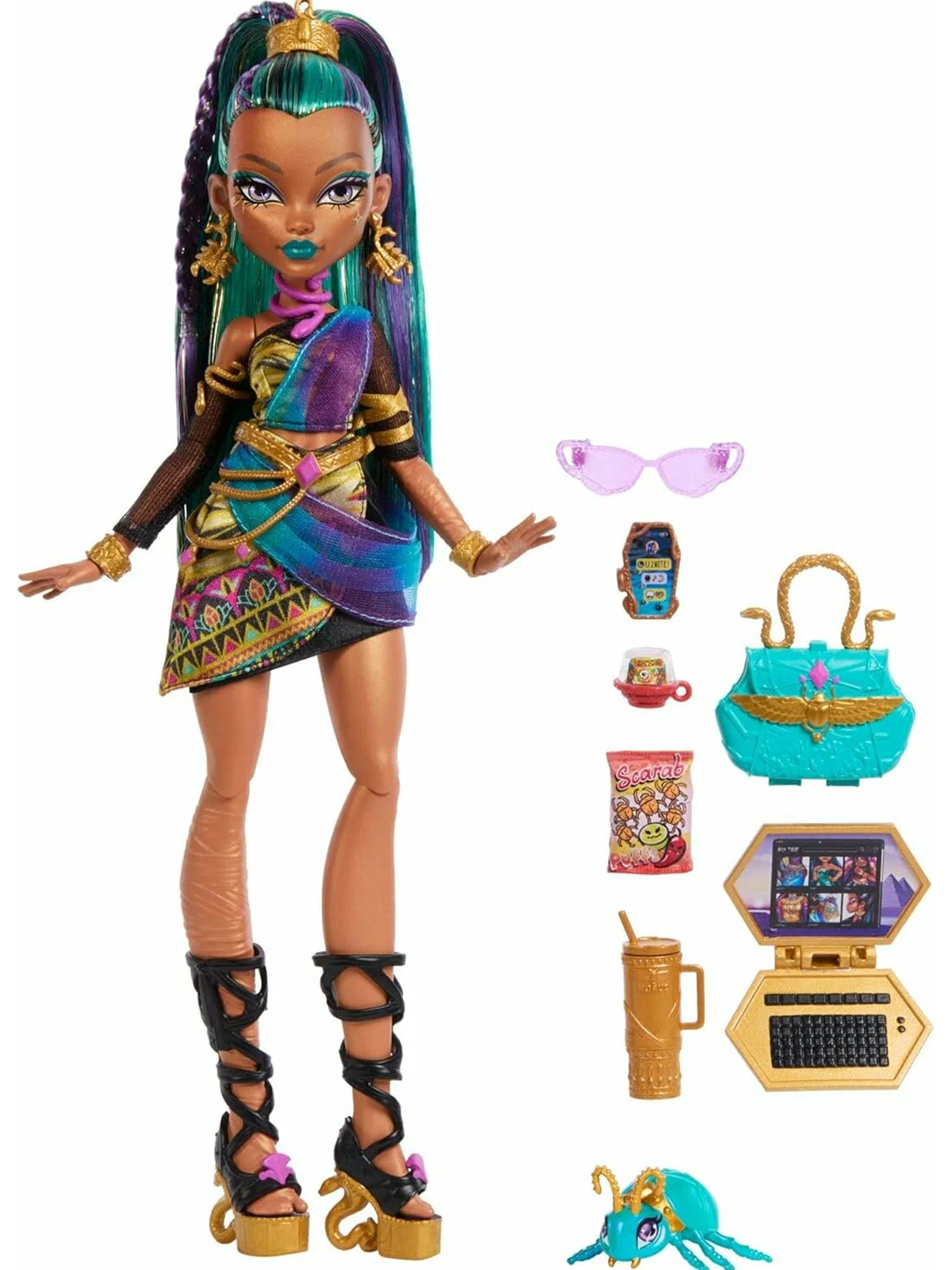 Кукла Нефера де Нил из серии Monster High JDR48 «Королевская мумия» — это коллекционная версия одной из самых величественных учениц Школы Монстров, выполненная в роскошной египетской эстетике. Её образ сочетает элементы древней царственности с современным гламуром: детализированная одежда, напоминающая облачения фараонов, с золотыми акцентами, драгоценными узорами и символам Египта (скарабеи, анкхи). Макияж, причёска и аксессуары (например, короны, ожерелья или посох) подчёркивают её статус королевской особы. Эта кукла станет жемчужиной коллекции для фанатов, ценящих исторические отсылки, сложный дизайн и харизму персонажей Monster High.