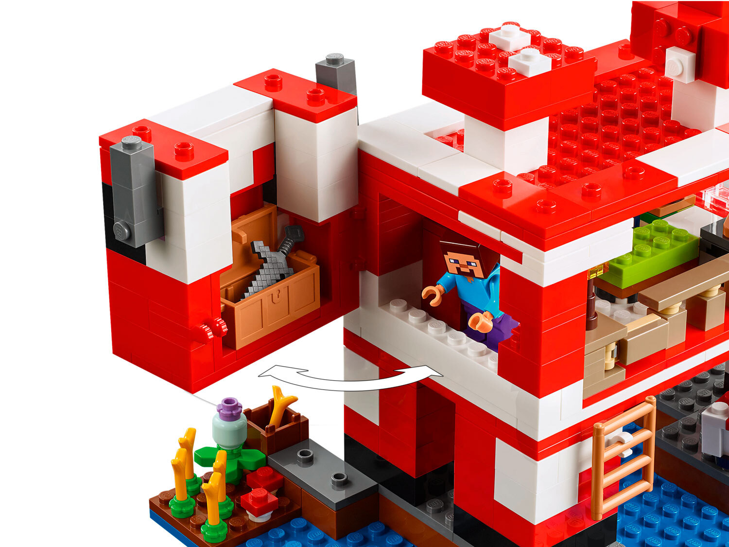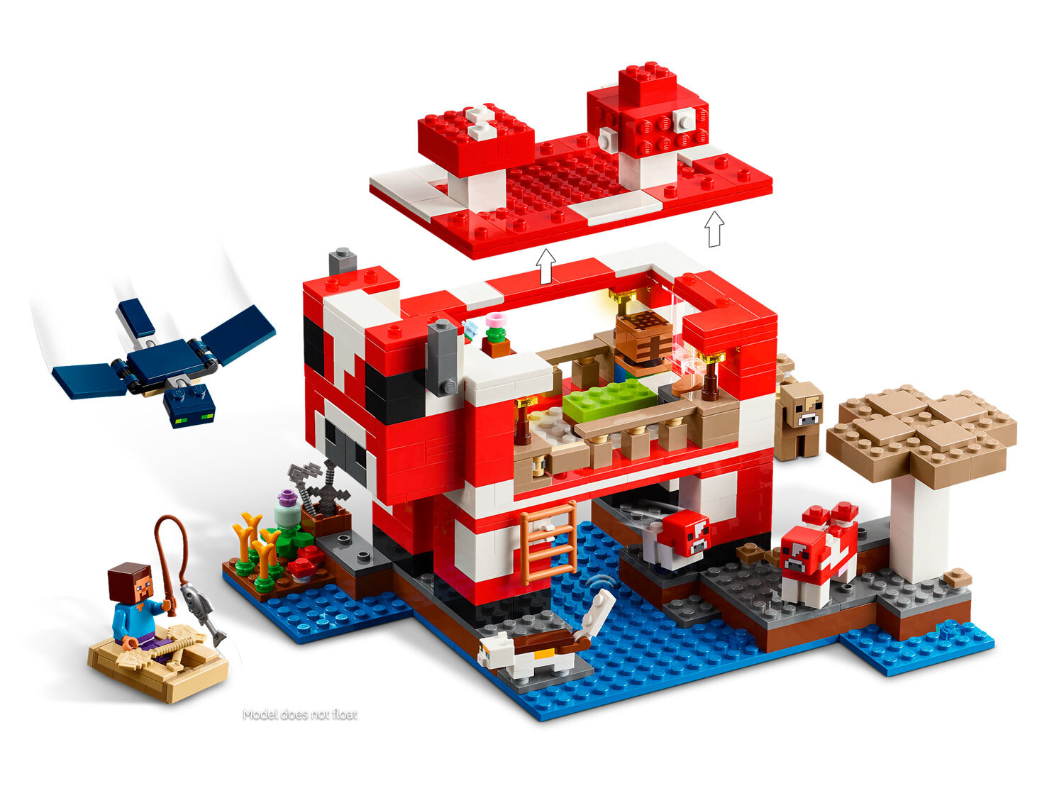 Внутри набора ребёнок найдёт фигурку персонажа игрока, коров-муухоморов и враждебного скелета. Можно собрать яркий дом-гриб с открывающейся крышей и детализированным интерьером, а затем придумать приключения: ухаживать за муухоморами, расширять жилище или защищаться от атаки моба.
