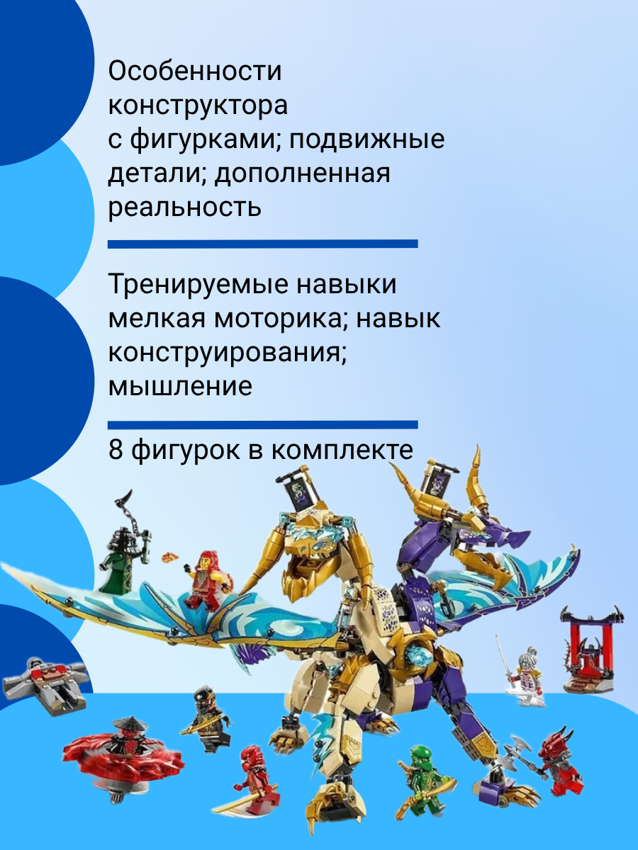 Этот удивительный набор позволит вам окунуться в захватывающий мир легендарных ниндзя и фантастических существ. Огромный дракон оснащен множеством подвижных элементов: расправляйте мощные крылья, раскрывайте грозные челюсти и готовьтесь к битве!
